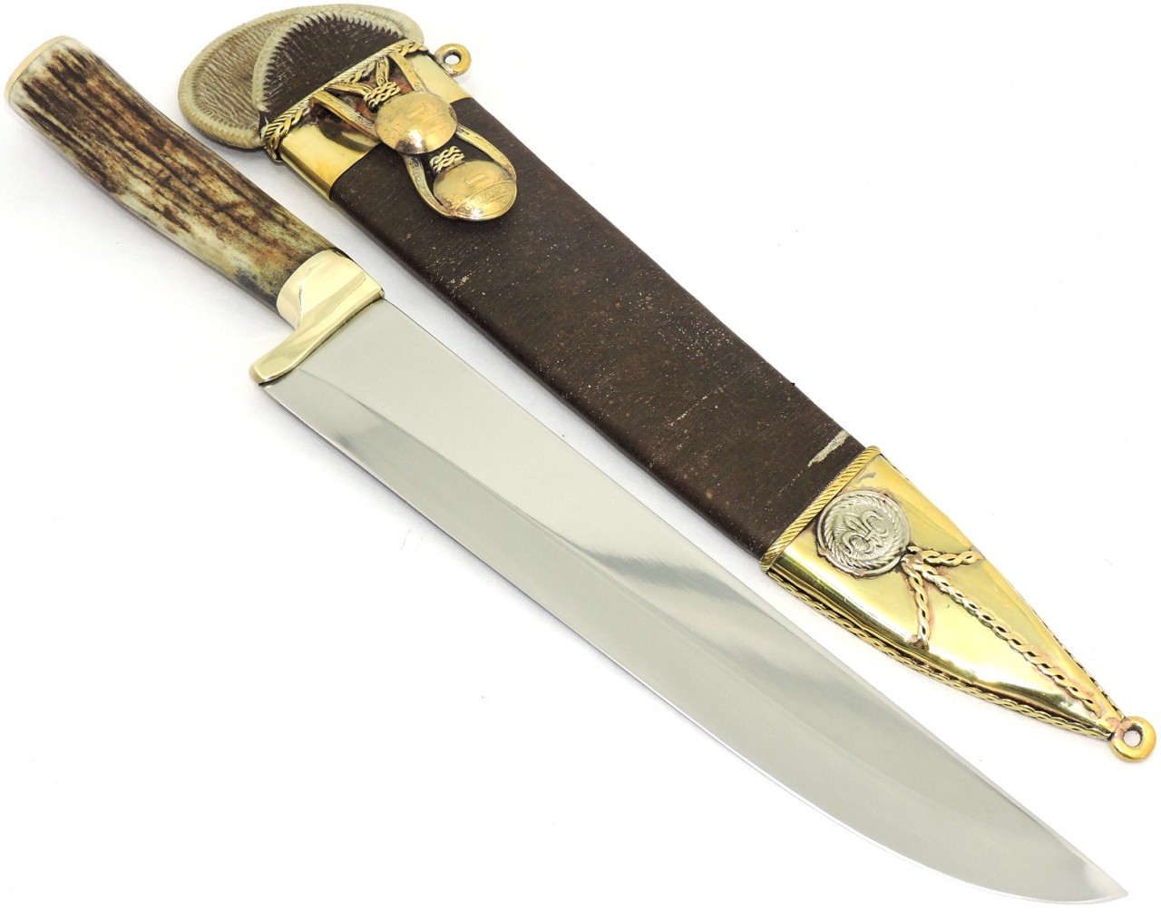 Cabo: Chifre de Cervo europeu - Axis, guarda e pomo em latão, combinando com a bainha.