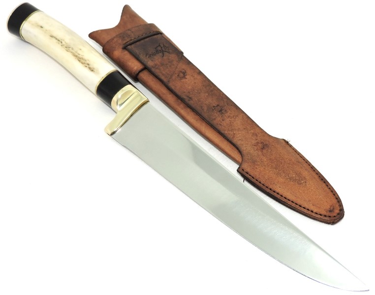 Cabo: Chifre de Cervo Europeu - Axis, boa empunhadura, guarda e pomo em latão maciço, fino acabamento.