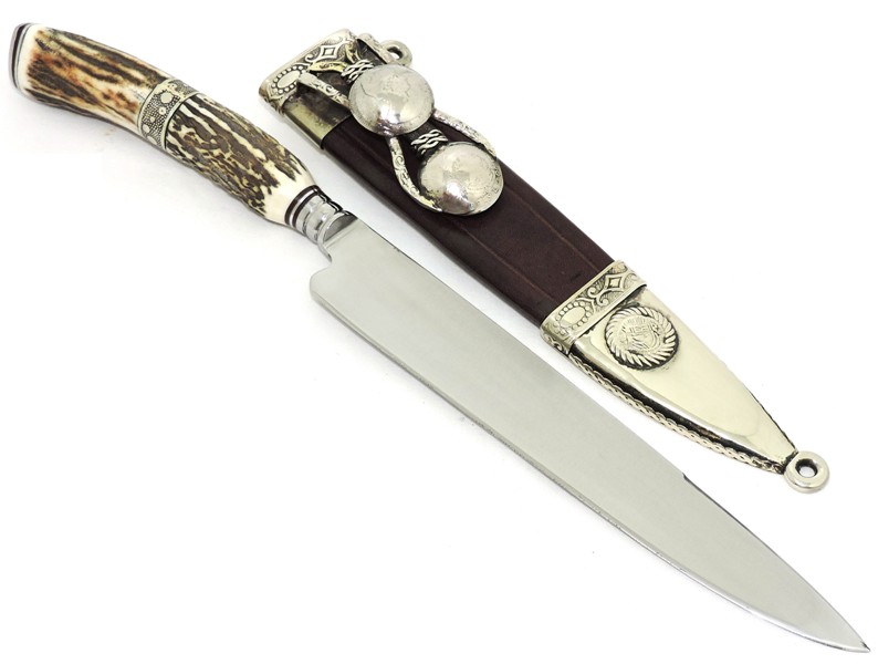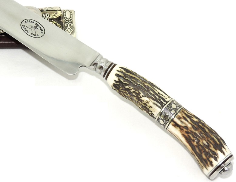 Cabo: Chifre de Cervo Axis trabalhado com Alpaca mexicana, excelente empunhadura, pomo em Inox, fino acabamento e boa pegada.