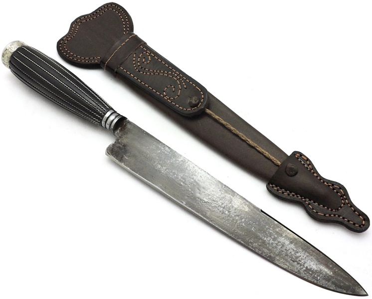 Faca muito antiga aço carbono de colecionador, foi recuperada, cabo e bainha novos.