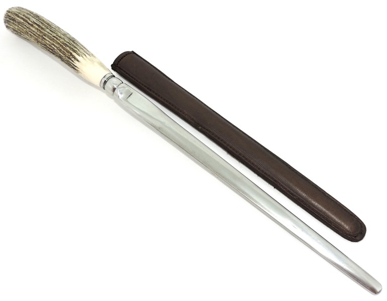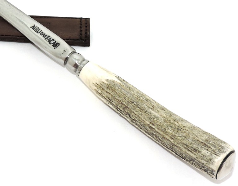 Haste: Oval Lisa / polida em aço 1095 forjado de antiga lima americana Nicholson Cabo: Chifre de Cervo Europeu Axis excelente empunhadura Bainha: couro natural bovino ========================= Medidas: Haste: 27 cm Cabo: 14 cm =========================
