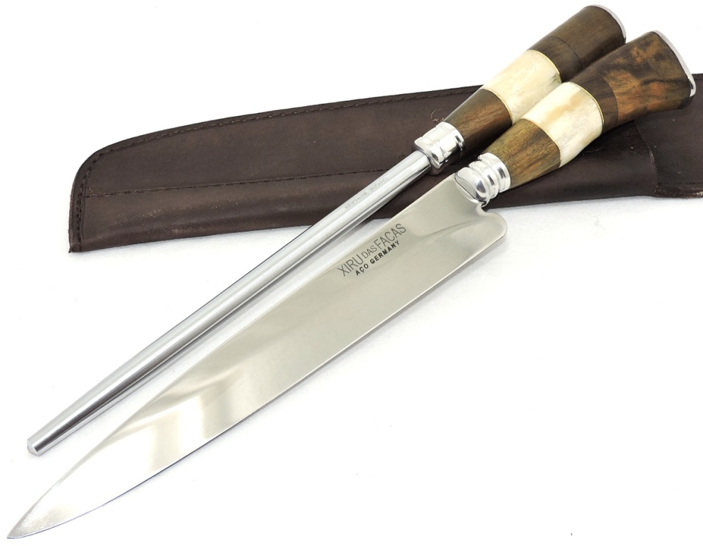 Cabo: Osso de cavalo e madeira nobre - Imbuia, anatômico de boa empunhadura, guarda e pomo em Inox.