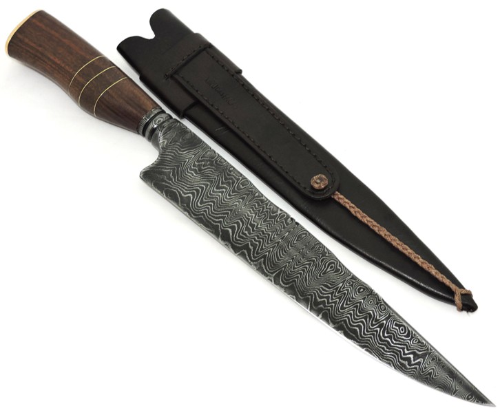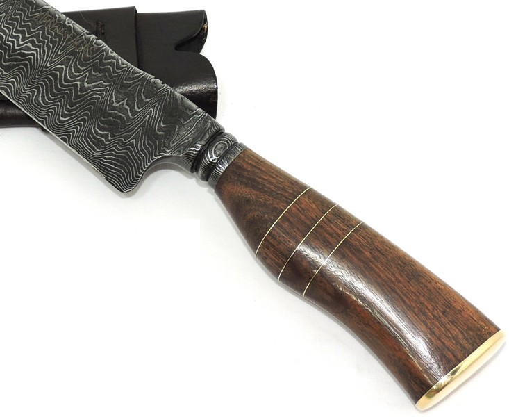 Lâmina: Aço Damasco, colarinho trabalhado na lima, com 420 camadas de 15N20 e 1095 intercalados, padrão Ladder, tratamento térmico profissional em forno de temperatura controlada, propiciando ao gume de corte, maior resistência mecânica excelente retenção do fio.