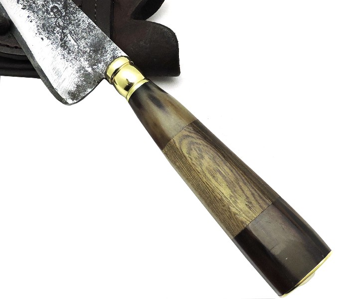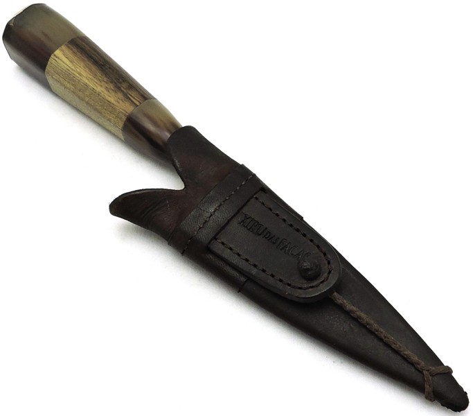 Cabo: Madeira nobre, cerno de Guajuvira e chifre bovino, guarda e pomo em latão, boa empunhadura.