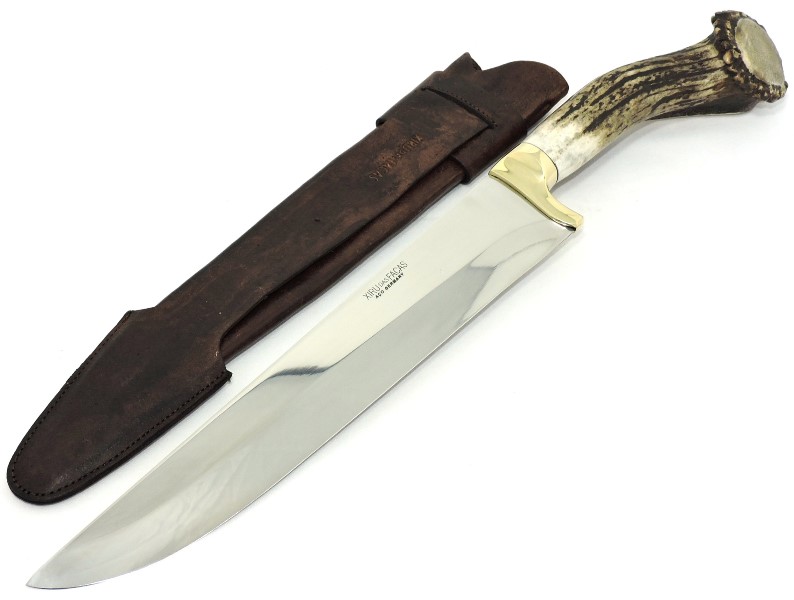 Empunhadura: Cabo de Chifre de Cervo com Roseta, excelente empunhadura, guarda em latão, fino acabamento.