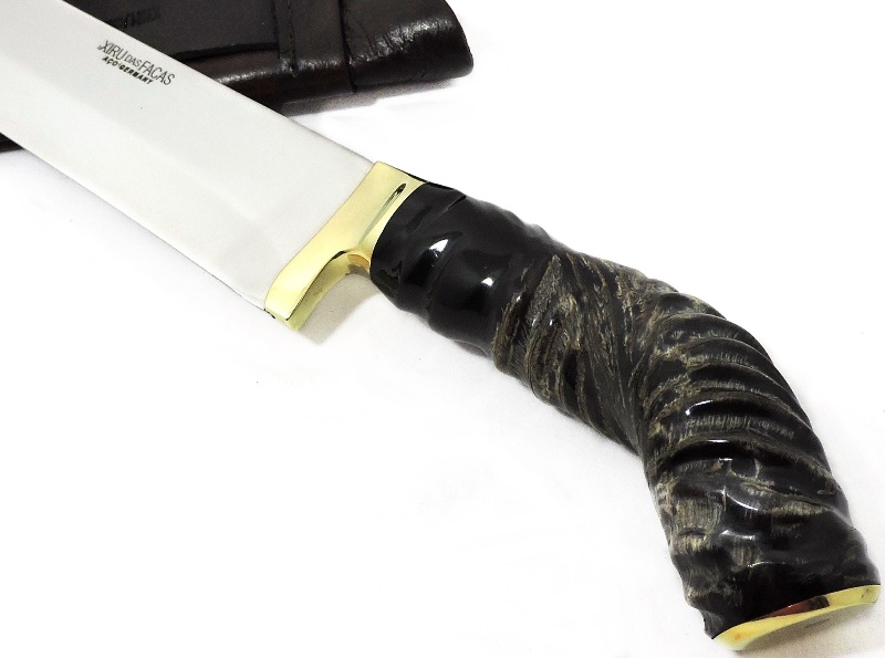 Cabo: Chifre de Antílope, anatômico de ótima empunhadura, guarda e pomo em latão de fino acabamento.