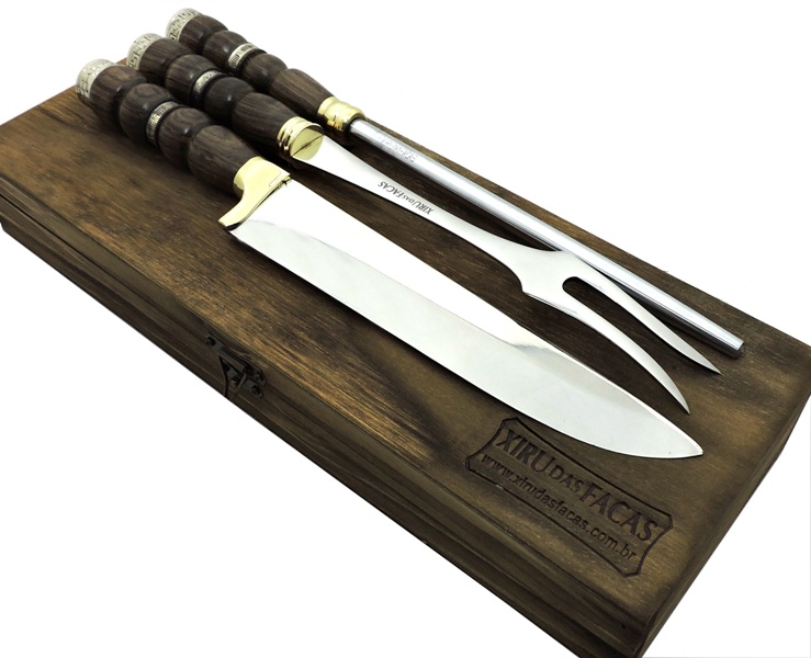 Conjunto Churrasco Gourmet: 3 peças - faca, chaira e garfo, sugestão para presente, acompanha estojo de madeira.