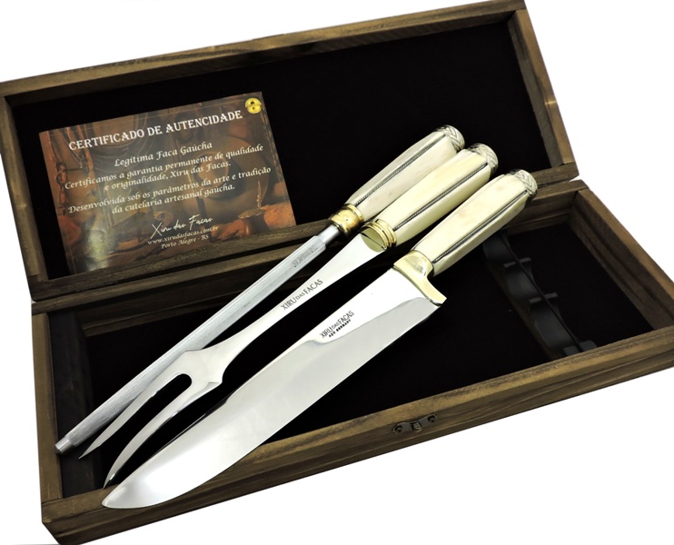 Conjunto Churrasco Gourmet: 3 peças - faca, chaira e garfo, sugestão para presente, acompanha estojo de madeira.