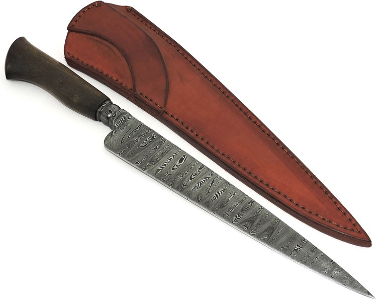 Lâmina: Aço Damasco, colarinho oriental trabalhado na lima, padrão Ledder, com 420 camadas de 15N20 e 1095 intercalados, tratamento térmico profissional em forno de temperatura controlada, propiciando ao gume de corte, maior resistência mecânica excelente retenção do fio.