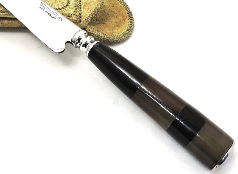 Cabo: Anatomico de chifre vacuno e búfalo de excelente empunhadura e, fino acabamento, tornando sua faca uma peça exclusiva.