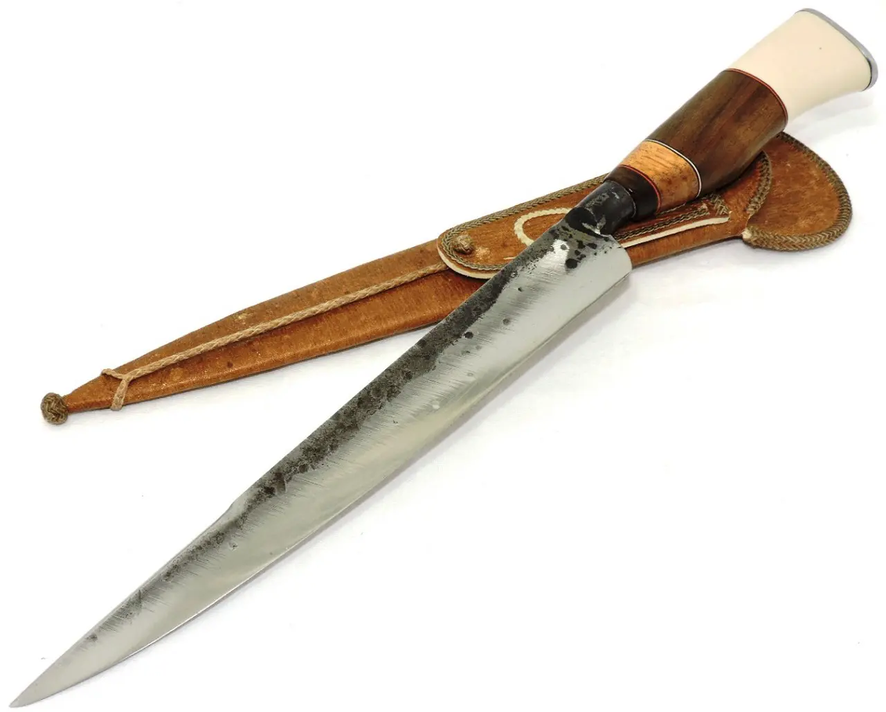 Bainha: Couro cru natural, trabalhado com lonca de cabrito com passante pra cinta, se ajusta perfeitamente a lâmina.