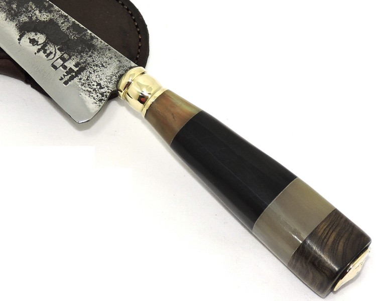Cabo: Chifre de búfalo, vacuno e madeira guajuvira, guarda e pomo em latão, excelente empunhadura.