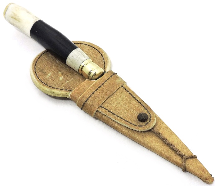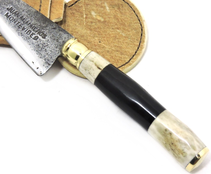 Cabo: Chifre de cervo Axis e chifre de bufalo, guarda e pomo em latão, excelente empunhadura.