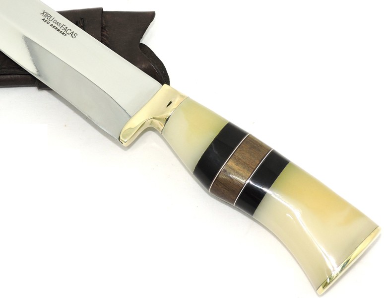 Lâmina: Aço Alemão Inox, integral entre cabo x lâmina com espiga, temperada e revenida em forno de temperatura controlada digitalmente, resultando assim uma perfeita combinação entre a dureza, flexibilidade e retenção do fio.