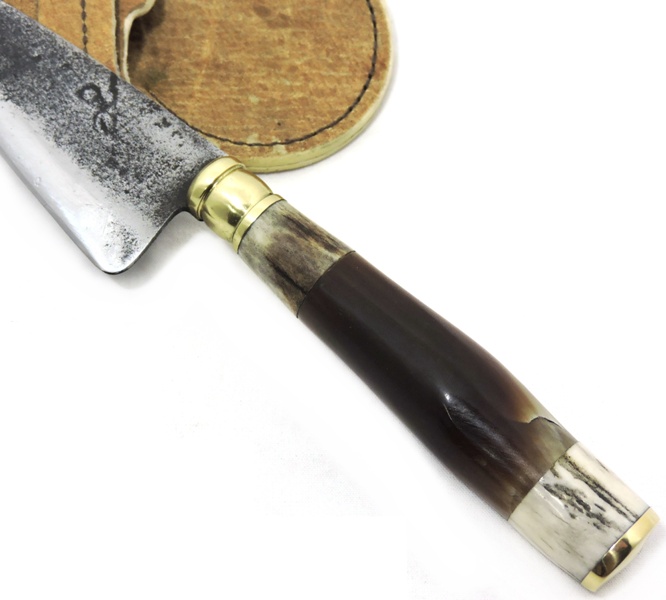 Cabo: Chifre cervo e chifre bovino guarda e pomo em latão, boa empunhadura.