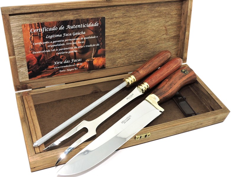 Conjunto Churrasco Gourmet: 3 peças - faca, chaira e garfo, sugestão para presente, acompanha estojo de madeira.