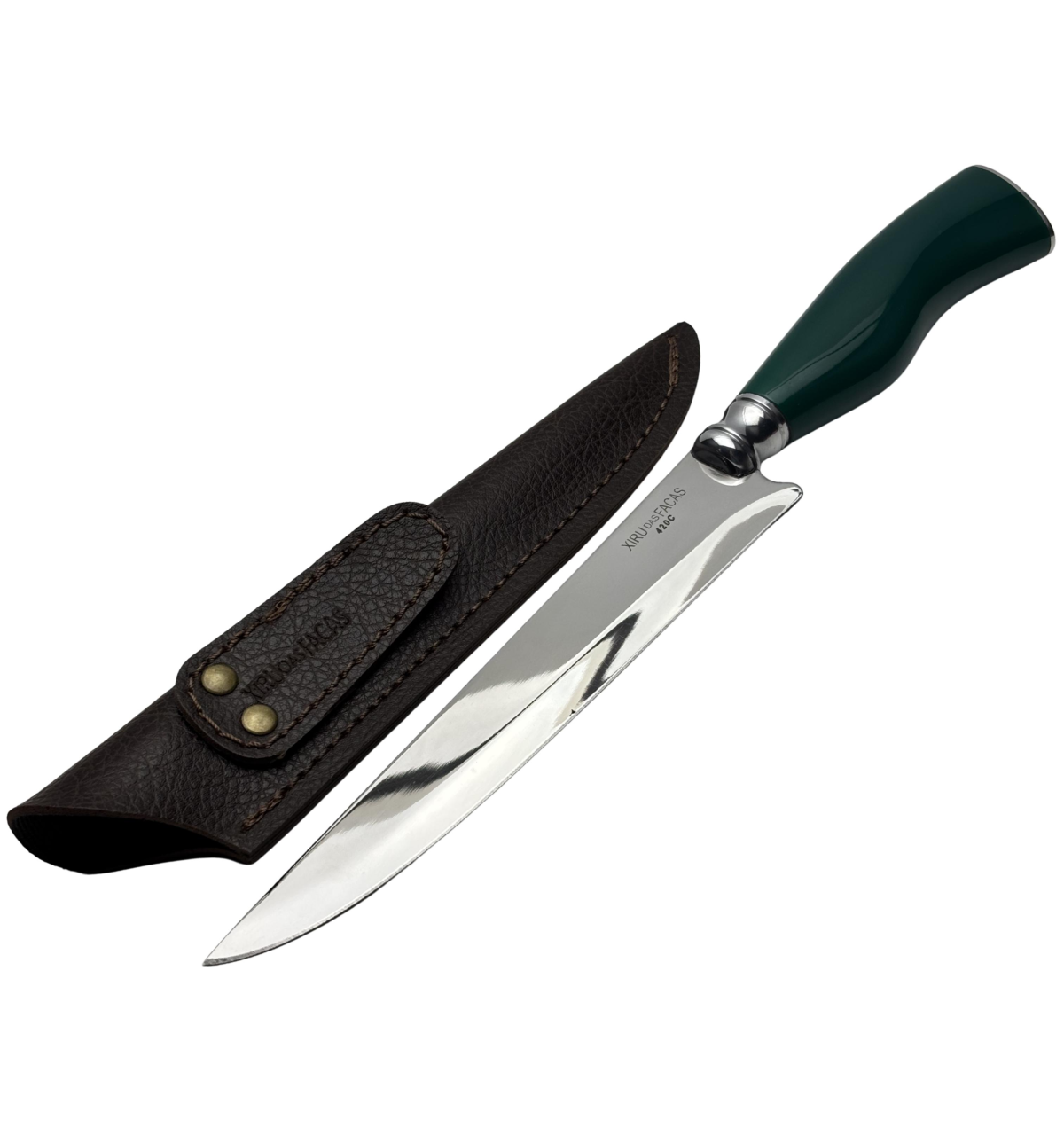 jamon Faca Jamoneira, Cortes Finos: Fiambres Peixes - Lâm. 33 cm. Churrasco Faca artesanal em aço alemão, especialmente desenvolvida para cortes finos: Jamon, Peixes, fiambres. Acompanha Certificado Garantia Xiru das Facas, bem como, instruções ... R$265,00